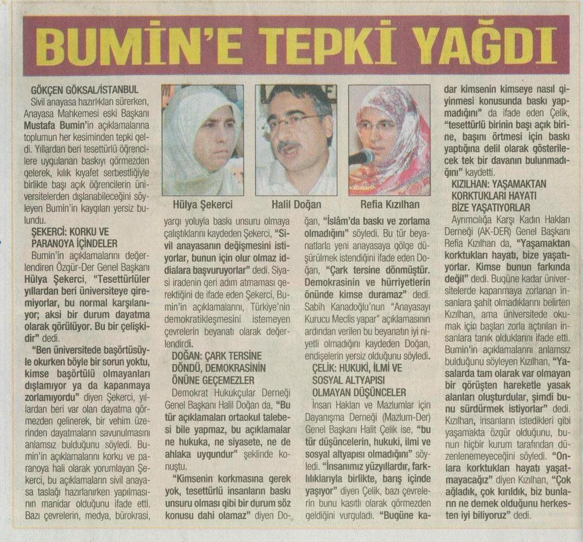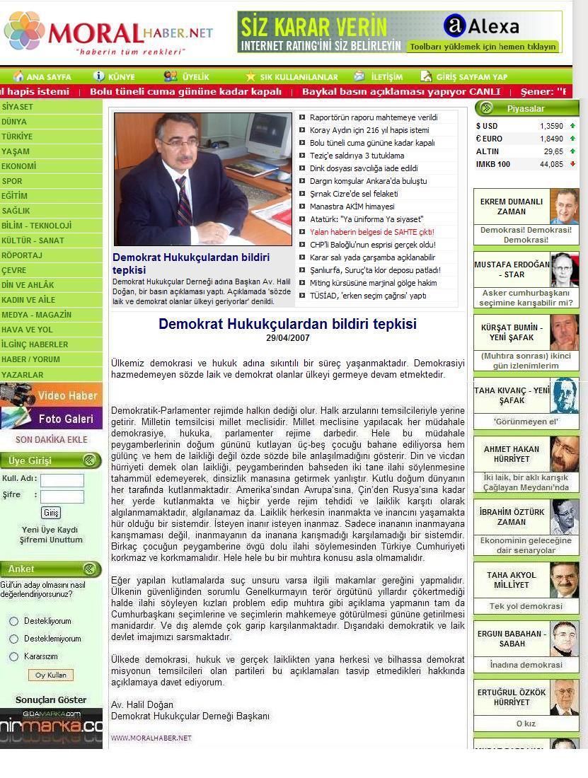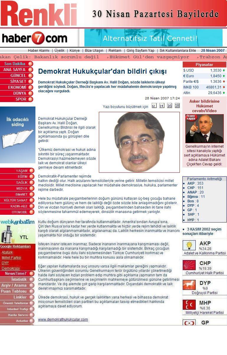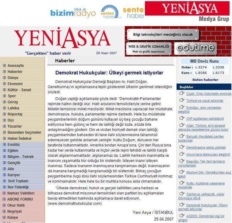 27 Nisan muhtırasına karşı Demokrat Hukukçular Derneği başkanı olarak yapılan açıklama - Yeni Asya Gazetesi.